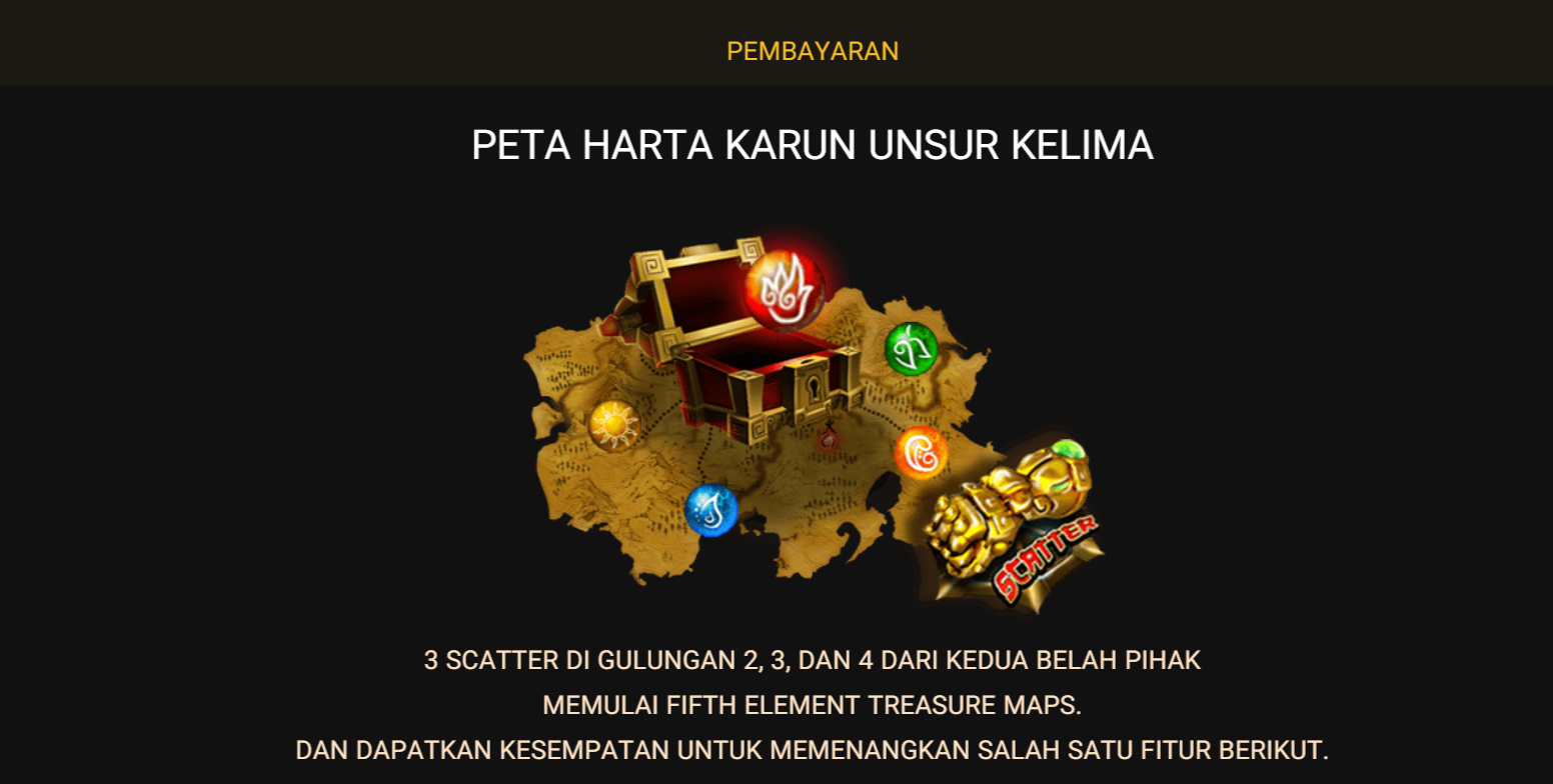 Fitur Peta Harta Karun Unsur Kelima bisa muncul ketika 3 simbol Scatter pada gulungan kedua, ketiga, dan gulungan keempat dari kedua belah pihak. maka Anda berkesempatan untuk memenangkan salah satu fitur dari ketiga fitur Kunci Keabadian, Jangan Takut Gagal, Dengan Tak Terbatas Pada Penerapan, Seperti Yang Anda Pikirkan, Anda akan menjadi Demikian, dan Jagalah The Heart Of The Empty Spirit.