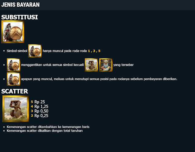 Game slot Sparta ini telah menggunakan 25 baris dengan semua simbol membayar kiri ke kanan, kecuali yang tersebar dari simbol alat berat dan raja yang mana membayar apa saja.